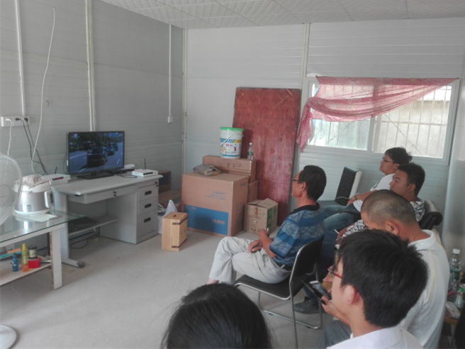 項(xiàng)目經(jīng)理王哲帶領(lǐng)項(xiàng)目部成員及農(nóng)民工收看閱兵儀式