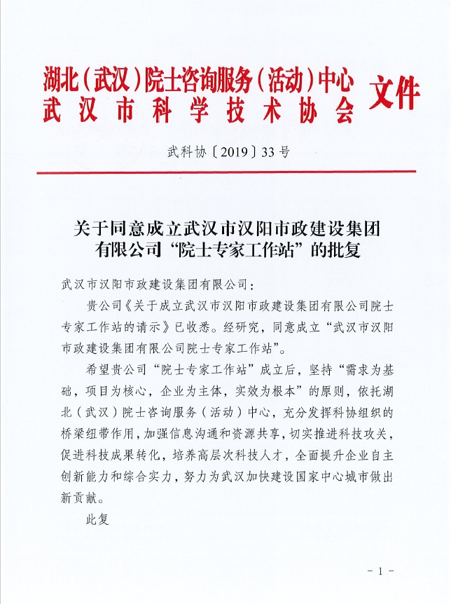2019年5月20日,湖北(武漢)院士咨詢服務(活動)中心、武漢市科學技術協(xié)會正式批復同意成立武漢市漢陽市政建設集團有限公司院士專家工作站。