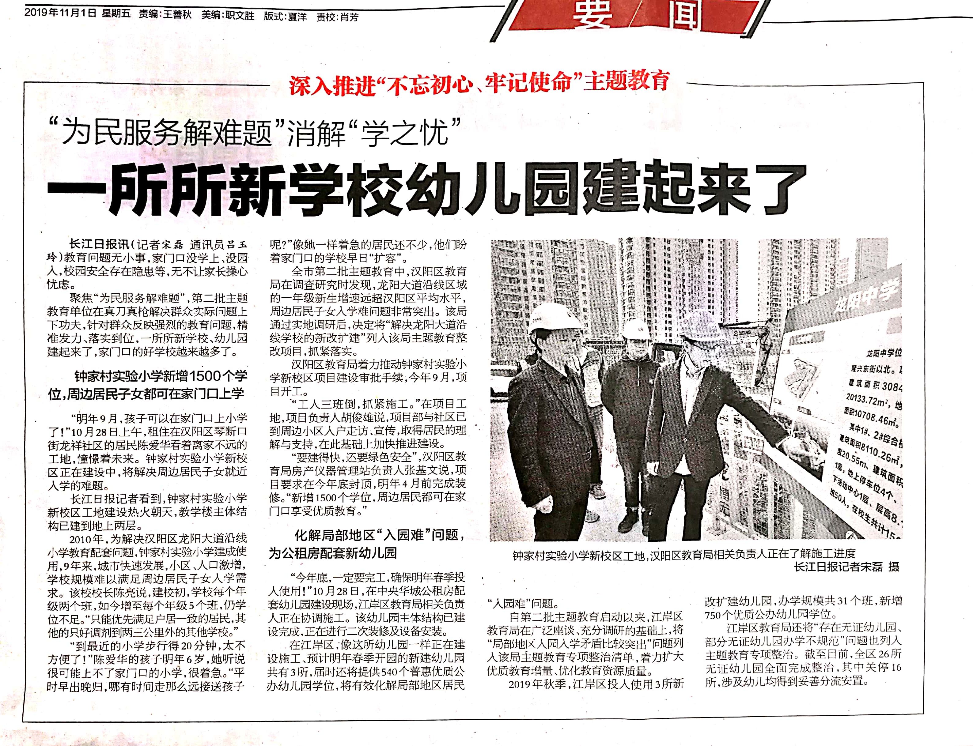 ?????????11月1日,《長(zhǎng)江日?qǐng)?bào)》以“‘為民服務(wù)解難題’消解‘學(xué)之憂’—一所所新學(xué)校幼兒園建起來了”為題,專題報(bào)道了龍陽中學(xué)項(xiàng)目(該項(xiàng)目建成后3—5年將作為鐘家村實(shí)驗(yàn)小學(xué)新校區(qū)使用)的在建情況和建設(shè)意義。