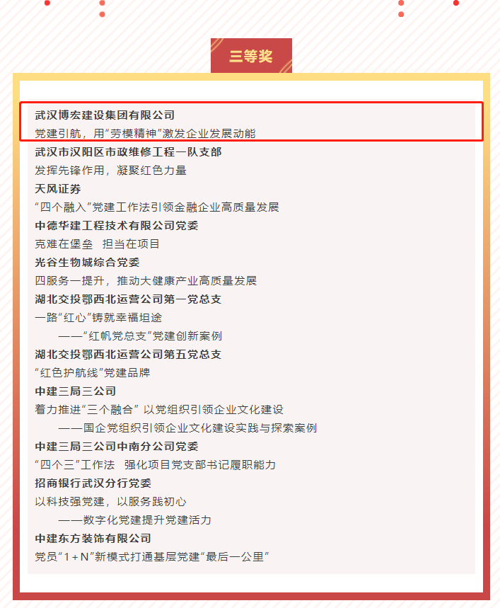 ? ? ? ?近日,首屆新時(shí)代企業(yè)黨建創(chuàng)新案例獲獎(jiǎng)名單公布,由博宏建設(shè)集團(tuán)推送的《黨建引航,用“勞模精神”激發(fā)企業(yè)發(fā)展動(dòng)能》品牌案例斬獲黨建優(yōu)秀案例三等獎(jiǎng)。?該項(xiàng)活動(dòng)由湖北省新時(shí)代文明實(shí)踐研究院、華中科技大學(xué)馬克思主義學(xué)院、華中科技大學(xué)黨的建設(shè)研究中心聯(lián)合紅艦智庫(kù)等機(jī)構(gòu)共同發(fā)起,博宏建設(shè)集團(tuán)推送的品牌案例在百余項(xiàng)案例中脫穎而出。