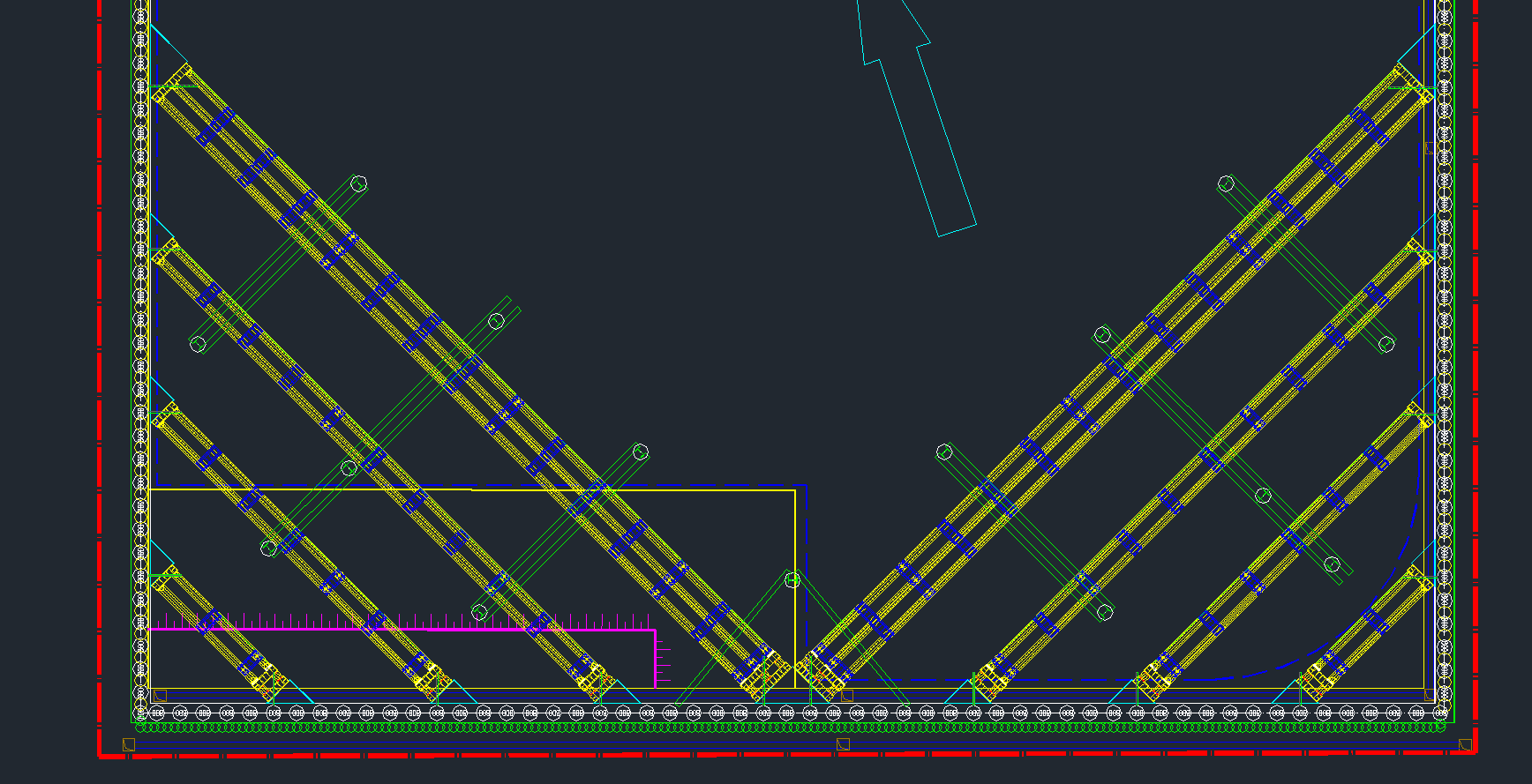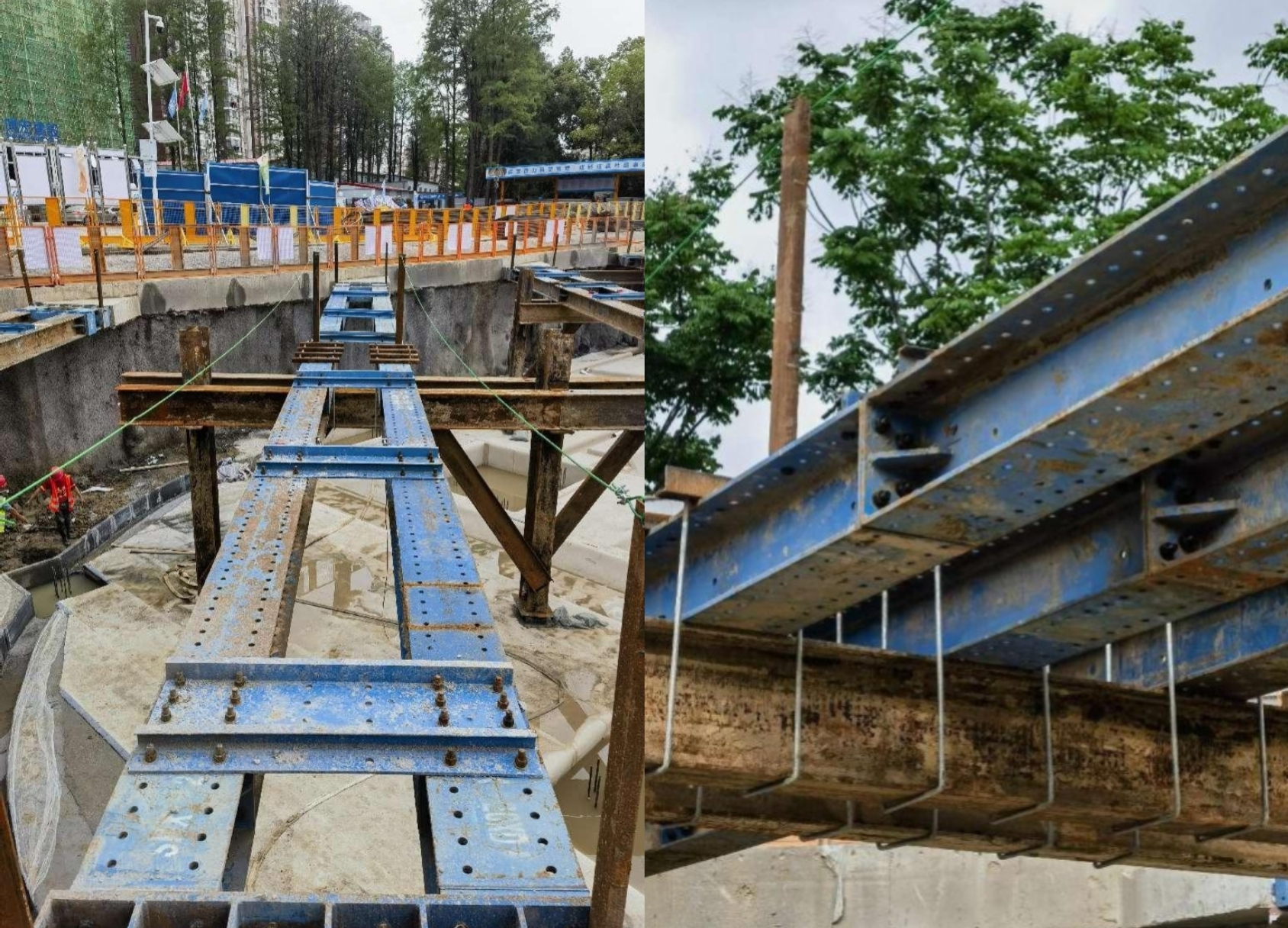 基坑南北兩側(cè)采用型鋼角撐,每一側(cè)角撐由四道型鋼斜撐組成,與冠梁形成45°角,由內(nèi)向外有雙拼型鋼和三拼型鋼兩種。型鋼采用HHC400ZC,長度根據(jù)標準件長度調(diào)整100A~12000A??缍容^大型鋼支撐設(shè)型鋼立柱,采用H488型鋼立柱。