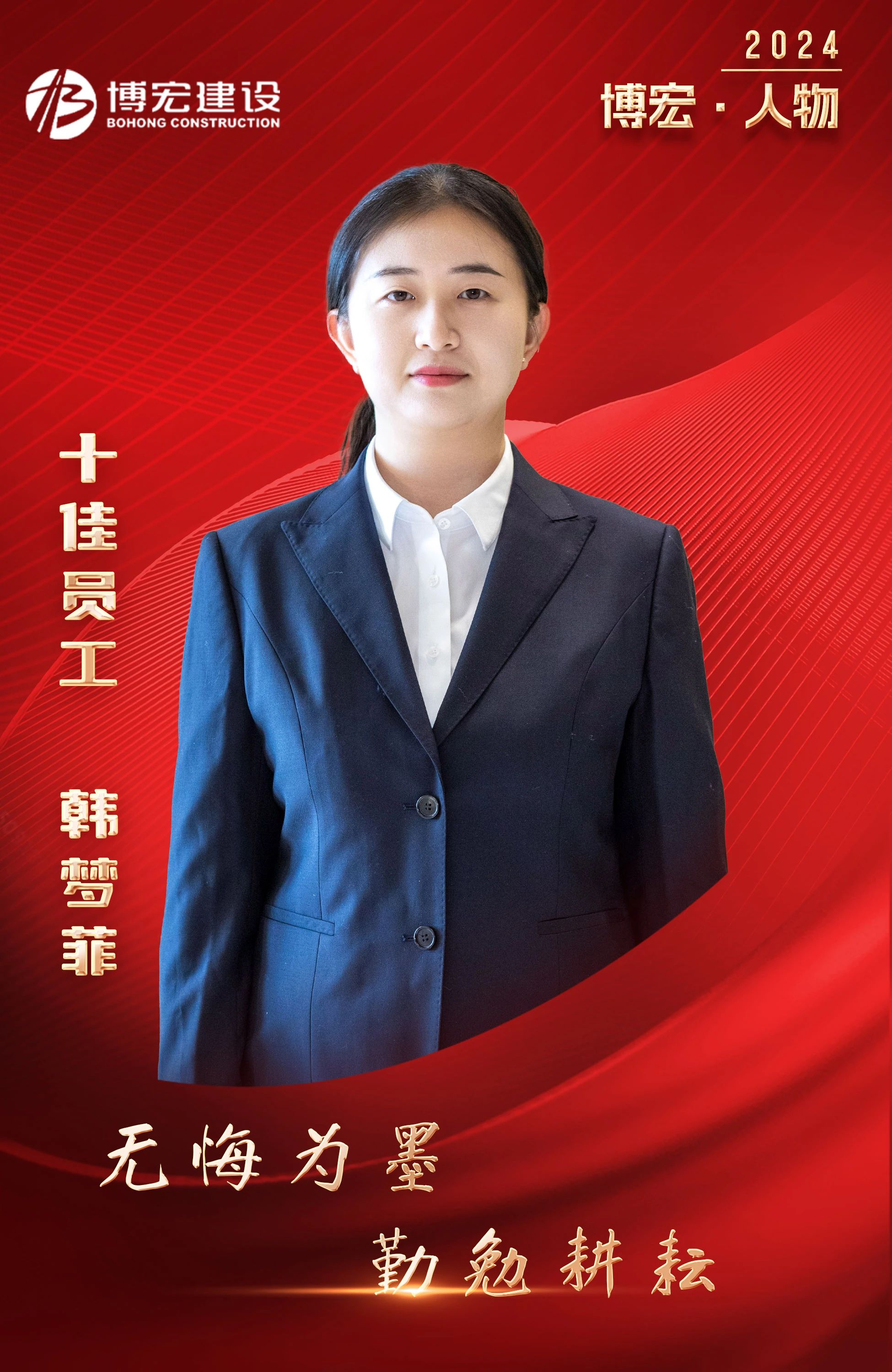 韓夢菲,黨建宣傳崗,入職博宏近2年,主導策劃了多次專題宣傳活動,讓宣傳思想工作更有滲透力、說服力、吸引力,逐步成長成為宣傳思想文化戰(zhàn)線上的骨干,榮獲博宏建設集團2023年度“十佳員工”。從宣傳專員到黨建專員,崗位轉(zhuǎn)變,但服務業(yè)務部門,為公司賦能的初心不變。