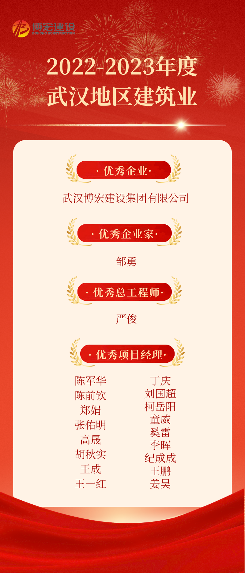 近日,2022-2023年度武漢地區(qū)建筑業(yè)優(yōu)秀企業(yè)、優(yōu)秀企業(yè)家、優(yōu)秀總工程師、優(yōu)秀項(xiàng)目經(jīng)理選樹結(jié)果正式發(fā)布,博宏建設(shè)集團(tuán)喜獲“大豐收”,獲評(píng)1項(xiàng)優(yōu)秀企業(yè)、1人獲評(píng)優(yōu)秀企業(yè)家、1人獲評(píng)優(yōu)秀總工程師、17人獲評(píng)優(yōu)秀項(xiàng)目經(jīng)理!