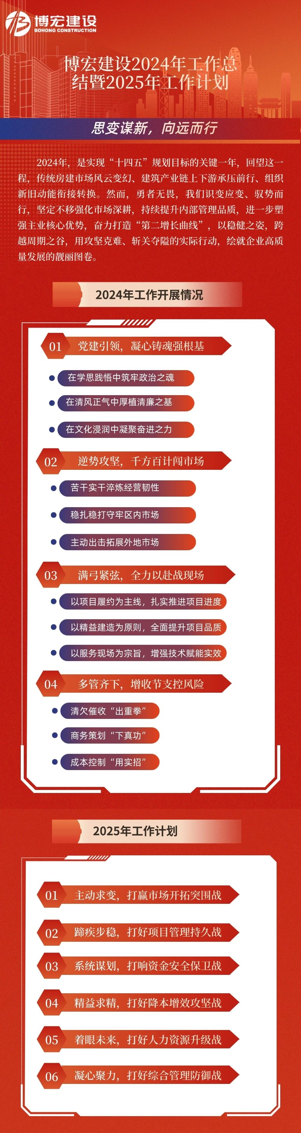 1月24日-25日,博宏建設(shè)2024年度總結(jié)表彰暨2025年工作研討會順利召開。公司黨委班子、部門負責人、項目經(jīng)理和員工代表共80余人參加會議。集團黨委書記嚴悌文、董事長虞志鵬、常務(wù)副總經(jīng)理錢濤受邀出席會議。會議由公司黨委副書記郭一清主持。